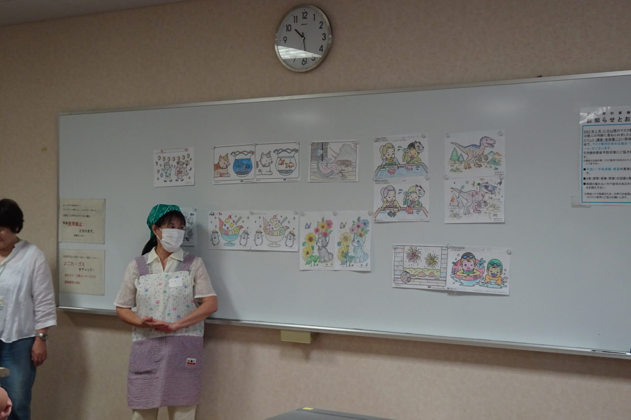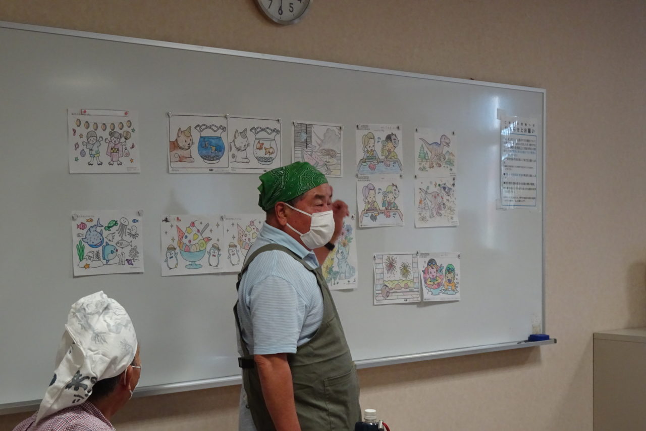 5月に続いて森本ADの指導の下、2回目のアートセラピーを体験しました。20種類以上のイラスト素材から1点を選び、30分余りの時間で色鉛筆を使って色を塗りました。完成した作品を白板に掲示して、作品に込めた思いを語り合いました。