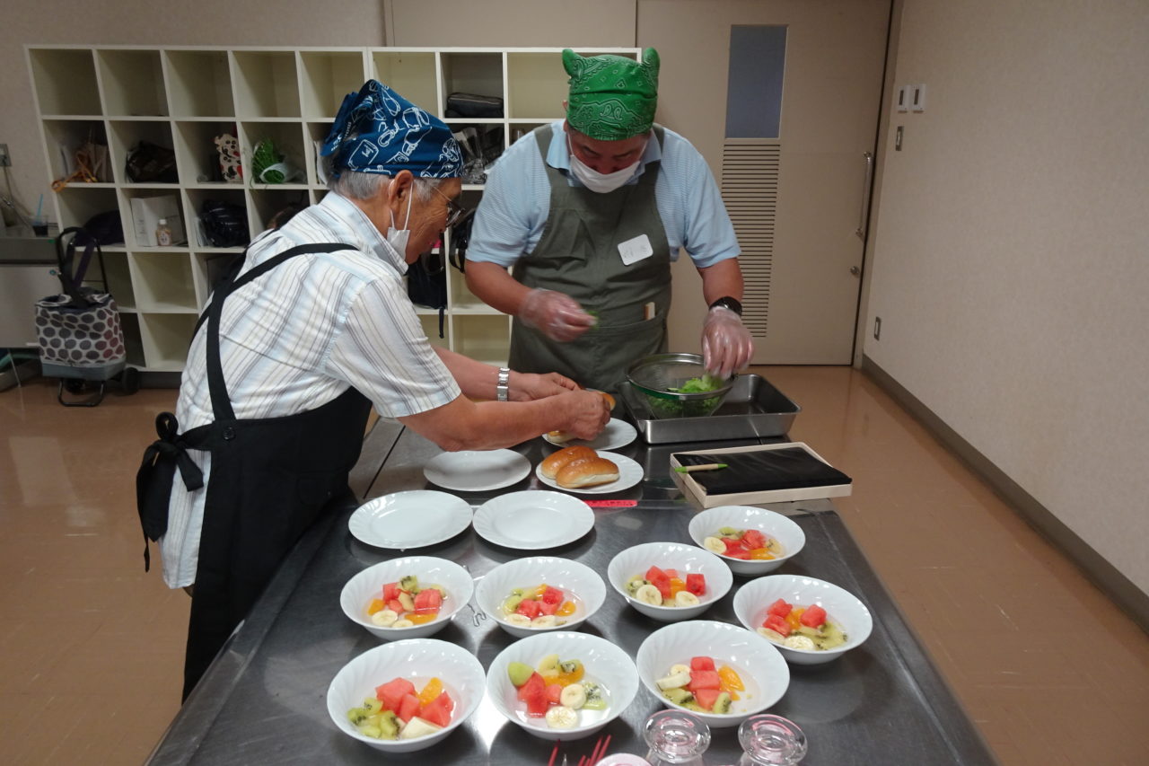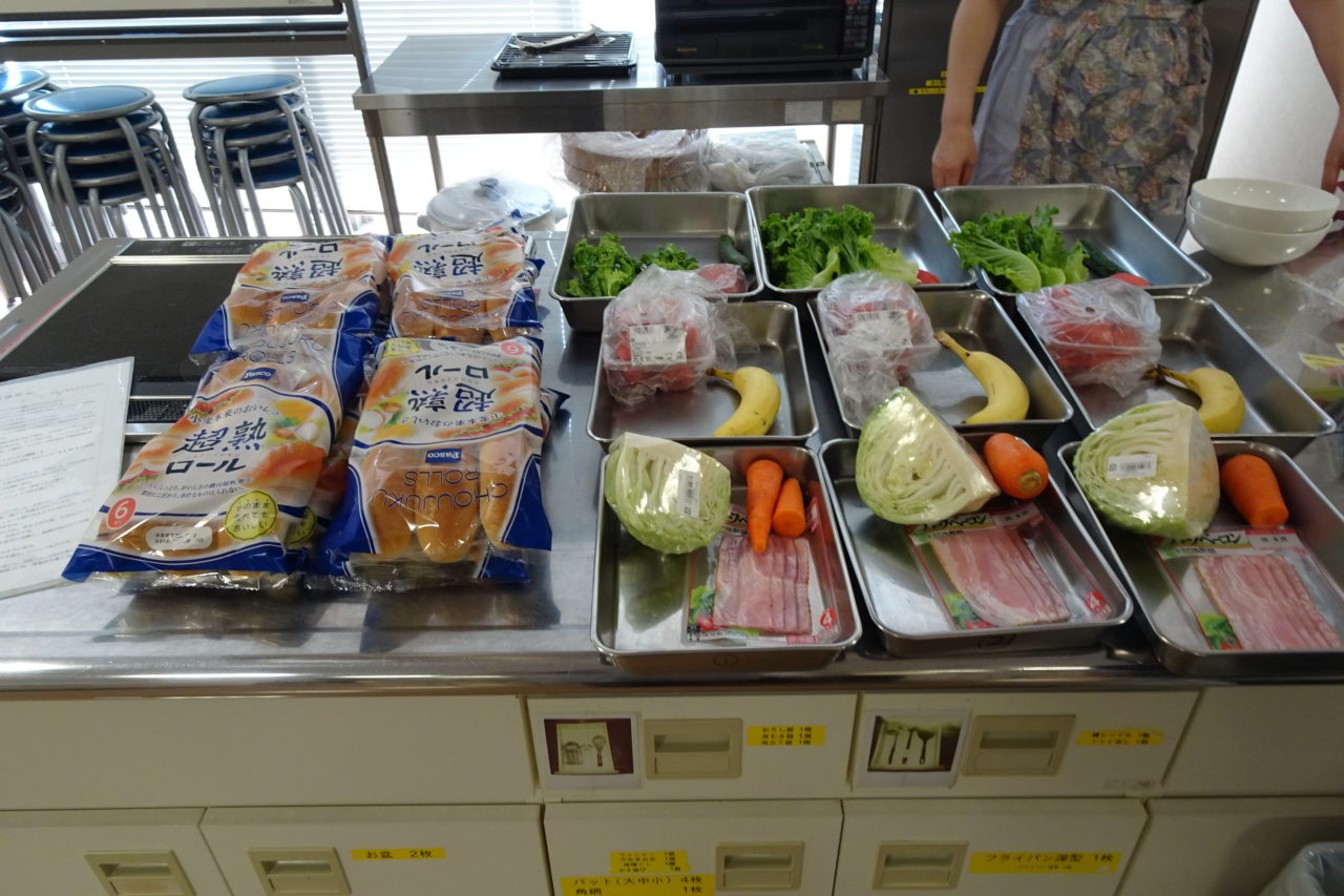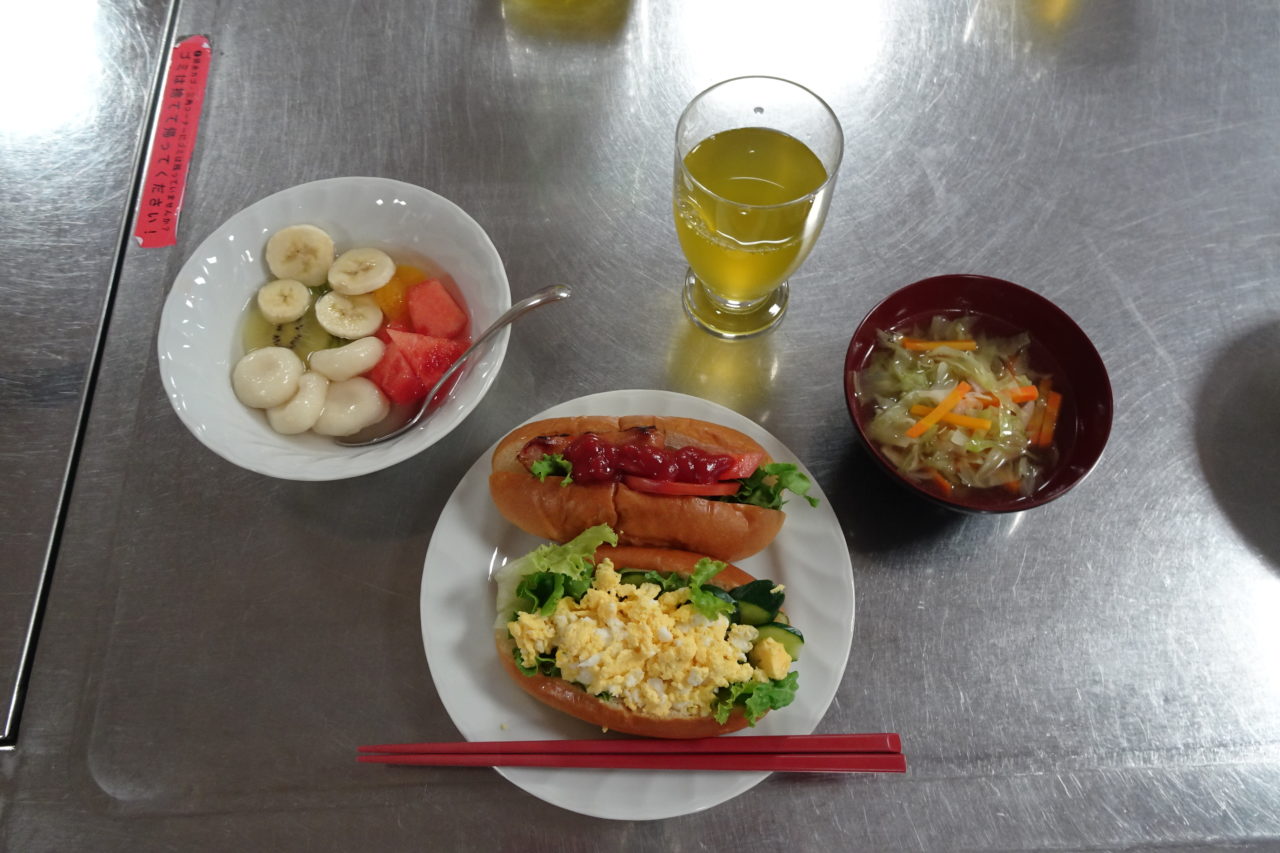川原ADの簡単料理講習会では、ホットドッグ、野菜スープ、フルーツポンチを作って食べました。卵、ウインナー、キャベツ、ニンジン、バナナ、キウイなどの食材を切って炒めて煮て調理しました。子供さんもお手伝いしてくれました。エネルギー572kcalとヘルシーでバランス良く、おいしかったです!