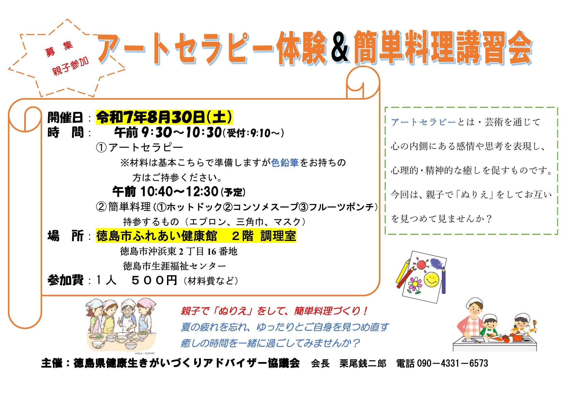 「高齢者等の居場所づくり」の第2弾として、徳島市沖浜東のふれあい健康館で「アートセラピー体験&簡単料理講習会」を8月30日(土)に開催しました。今回は「多世代交流」をテーマに、3歳のお子さんから80代の方まで合計22名で楽しく交流しました。