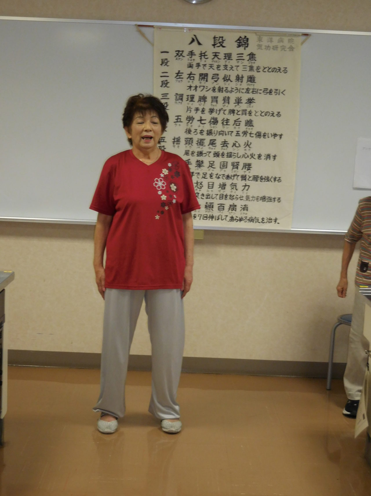 八段錦は松浦ADより「始める前の注意」や「自覚効果」のお話がありました。音楽に合わせて、八段錦を第一段から順番にすると身体がほぐれて来るのがわかります。