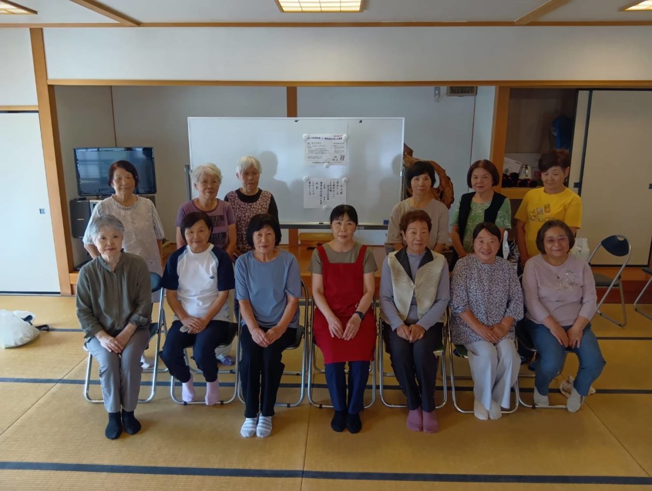 「高齢者等の居場所づくり」活動のフィナーレは、2025年10月6日(月)に徳島県三好市池田町の井ノ久保活性化センターで「いきいき100歳体操&備蓄食品を使った調理実習」を開催しました。参加者は徳島からの2名を含めて14名(☆男性1名)でした。